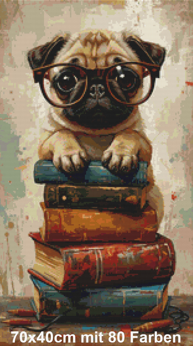 Der Mops wollte nie klug sein. Es ist einfach passiert. Zwischen zwei Nickerchen und einem Keks hat er festgestellt, dass Nachdenken anstrengend ist – aber klug aussehen erstaunlich effektiv.