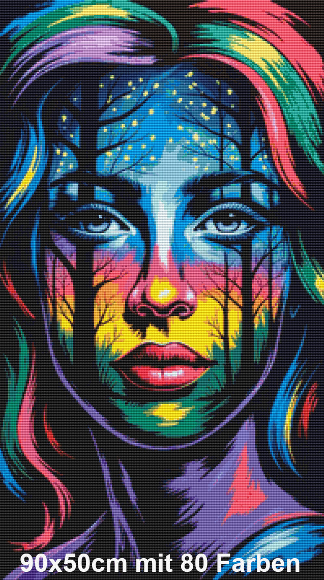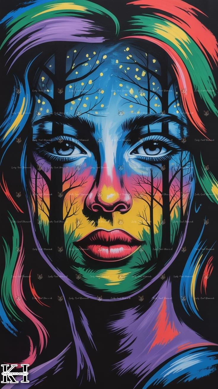 In ihrem Gesicht spiegeln sich die tiefen Wälder der Nacht, endlose Gedanken und das ungeklärte Gefühl, mehr zu sein als nur ein Abbild. Jeder Baum, der sich durch die Konturen zieht, steht für Erinnerungen und Wege, die noch nicht vollständig entdeckt wurden. Die funkelnden Lichtpunkte am Himmel symbolisieren flüchtige Momente des Erwachens, Augenblicke, in denen Klarheit und Unsicherheit sich umarmen.